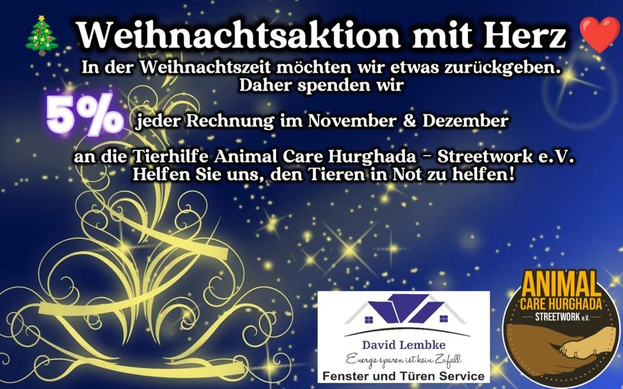 Wir die Firma David Lembke Fenster und Türen Service möchte die Weihnachtszeit nutzen, um etwas Gutes zu tun. Deshalb haben wir uns entschieden, die wichtige Arbeit der Tierschutzorganisation Animal Care Hurghada - Streetwork e.V. zu unterstützen.